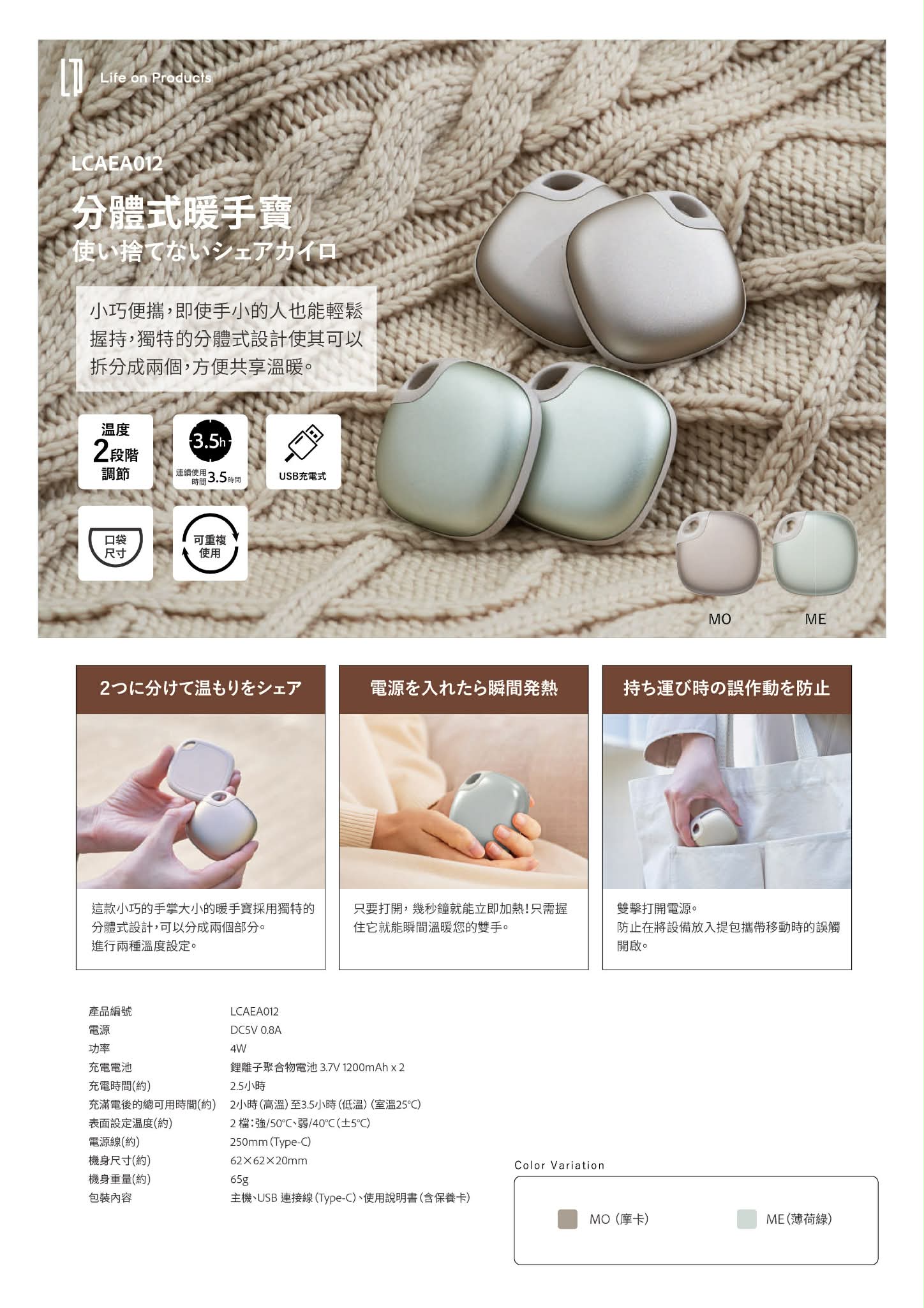 《pre-order》 💥預訂款💥需時大概7-21日💥 🇯🇵日本Life on Products 分體式暖手寶 🇭🇰香港行貨,一年保養 🇯🇵日本人氣產品 Life on Products分體式暖手寶強勢到港🥳🥳 真正一機兩用,兩個獨立機身可同時運作,溫暖隨時分享❤️ 強弱兩段溫度,40/50°C 快速發熱,無論自用還是同朋友一齊用都咁方便👍🏻 懂65g 輕巧易攜,無線設計收納簡單,雙擊開啟防誤觸,安全又貼心,讓您的整個冬天都溫暖隨身🥰 🌈有2色可供選購 摩卡色 薄荷綠 ✔️造型迷你,小巧便攜,輕鬆握持 ✔️分離式獨立機身設計,一機兩用,可分為2個獨立暖手寶調節不同溫度,方便分享共用 ✔️無線輕巧,只有口袋大小,可以放在任何地方 ✔️充電式設計,充滿電後最高使用時間可達約3.5 小時(弱) ✔️2 檔溫度調節,快速發熱,(強50°C/弱40°C)(+-5°C) ✔️誤操作預防設計,雙擊開啟功能安全安心 ✔️輕巧精緻,重量只有約65g ✔️機體由兩個電池組成容量高達 1200mAh*2,可分開使用 ✴️產品規格✴️ 產品型號:LCAEA012 電源:DC5V 0.8A 功率:4W 充電電池:鋰離子聚合物電池3.7V 1200mAh x2 充電時間(約):2.5 小時 充滿電後的總可用時間(約):2小時(高溫)至3.5小時(低溫)(室溫25°C)表面設定温度(約):2檔:強/50°C、弱/40°C(土5°C)電源線(約):250 mm (Type-C)機身尺寸(約):62×62×20mm 機身重量(約):65g 包裝内容:主機、USB 連接線(Type-C)、使用說明書(含保養卡)