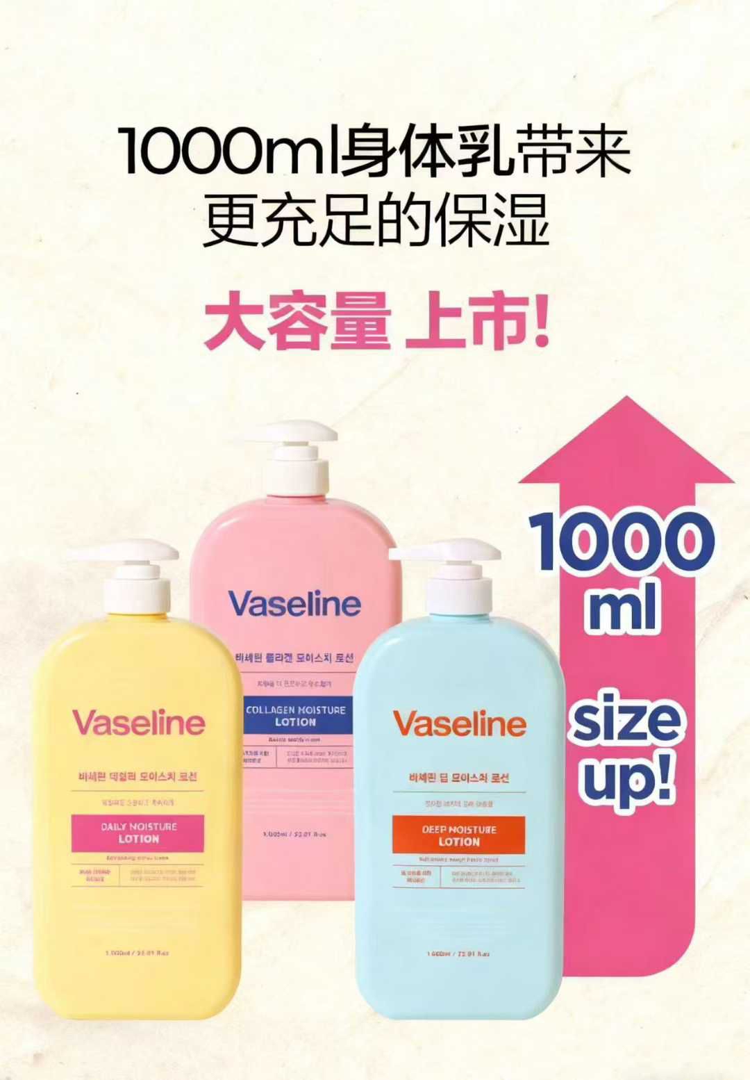 《pre-order》 🔖11月30號截單 🇰🇷韓國凡士林深層保濕身體乳系列(1000ml) 📦12月下旬到貨 🍂秋冬⛄️皮膚痕同乾到爆😭😭 乾燥肌既救星黎喇😍😍 大家可以試下呢款,深層保濕既身體乳 🉐性格比超高,大大支,超耐用‼️ 從此和粗糙乾燥肌講拜拜👋 🌈有3款可供選購 藍色 粉紅色 黃色 ✴️產品資料✴️ 🩵藍色(深層保濕款) 質地水潤,深層保濕,針對乾燥肌膚,強韌防護 🩷粉紅色(膠原蛋白款) 在保濕基礎上添加膠原蛋白,一抹化水,堅持用,感覺肌膚更Q彈有光澤,摸起來細膩光滑 💛黃色(日常保濕款) 質地最輕薄,清爽乳液感,夏天用也毫無壓力 ✅大大支1000ml,超耐用,沐浴後堅持塗抹,一個秋冬都不再乾燥👍🏻 ✅成分安心,溫和不刺激,凡士林經典品質,敏感肌膚也能安心使用❤️ ✅ 不黏膩:每款質地都經過精心調配,快速吸收不沾衣服 規格:1000ml 產地:韓國🇰🇷
