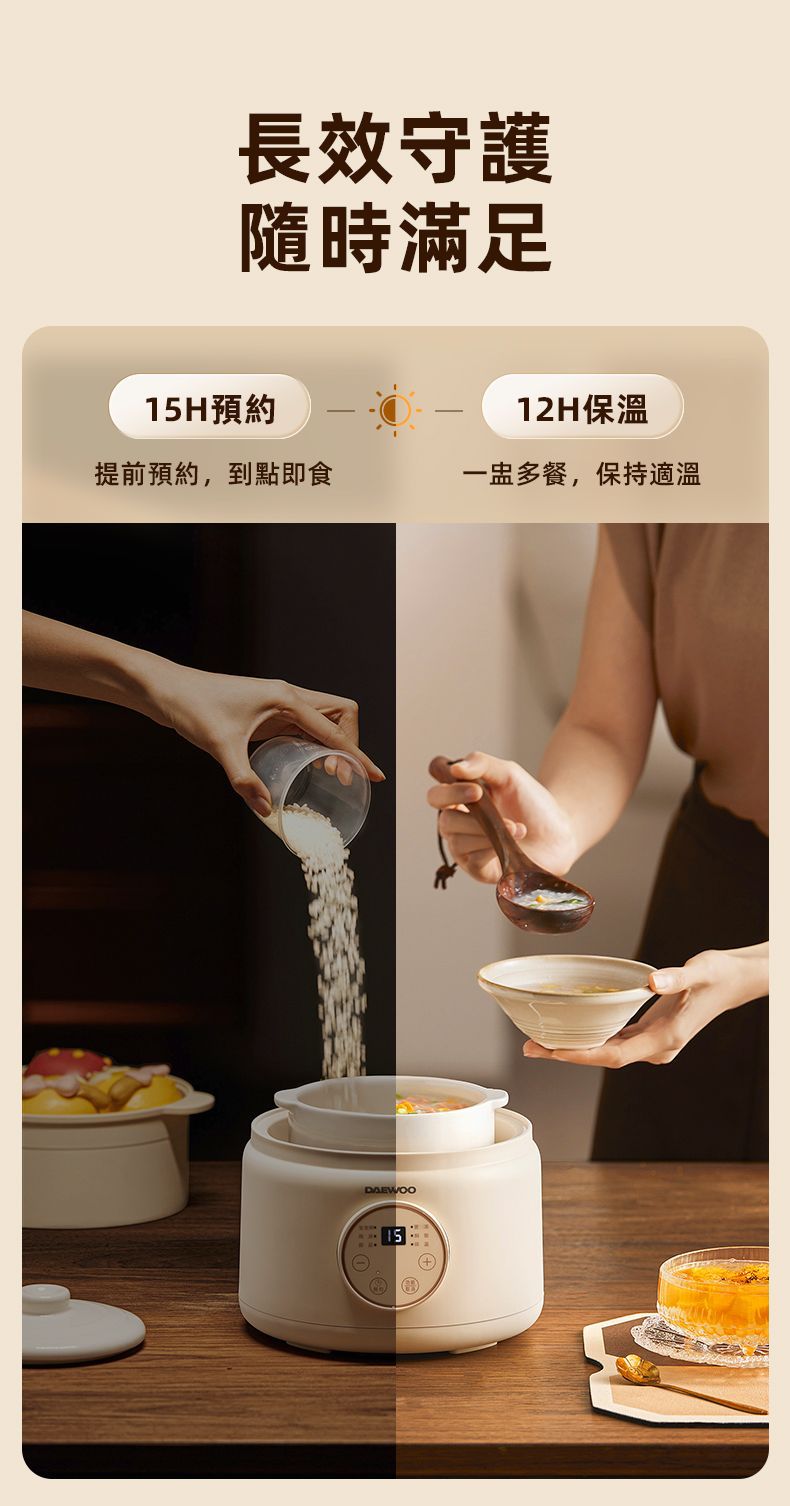《pre-order》 💥預訂款💥需時大概7-21日💥 🇰🇷韓國DAEWOO DY-DZ05 多功能燉煲 (附送蒸籠) 🇭🇰香港行貨,一年保養 DAEWOO🆕新出品DY- DZ05 多功能燉煲 一款多功能的料理幫手,六大功能,燉湯,粥糊,甜品,蒸煮,燜飯,保溫任君選擇。 🎁附送蒸籠更能體驗上蒸下燉的高效料理,輕巧機身方便收納,分體式設計更易清潔。 12H保溫,15H預約的定時設計更是家居廚房必選👍🏻 ⭐️產品特點⭐️ ✔️六大功能,燉湯,粥糊,甜品,蒸煮,燜飯,保溫,多功能任君選擇一鍵自動免看管 ✔️分體式設計,拆洗方便,清潔更輕鬆 ✔️簡約設計,上蒸下燉, 一鍋多用省時高效,料理更方便 ✔️3D環流導熱設計,確保食材均勻受熱 ✔️1L容量,一次燉煮3碗份量滿足您的胃口 ✔️定時設計,12H保溫,15H預約料理,隨時享用熱騰騰美食 ✔️LFGB德國食品認證強化白瓷燉盅,儲熱性能高更堅固耐磨 ✔️雙蓋密閉微壓,水汽不外溢,實現鎖水熬燉確保營養 ✔️安全保護,自動防乾燒,缺水斷電,安全省心 ✔️簡約操作面板,按鍵操作簡單易用 ✴️產品規格✴️ 產品名稱: 多功能燉煲 產品型號:DY-DZ05 額定功率:200W 額定容量:1L 產品淨重(約):標準款:1.5kg/蒸籠款:1.6kg 產品尺寸(約): 標準款:198mm*195mm*216mm 附蒸籠款:198mm*216mm*293mm