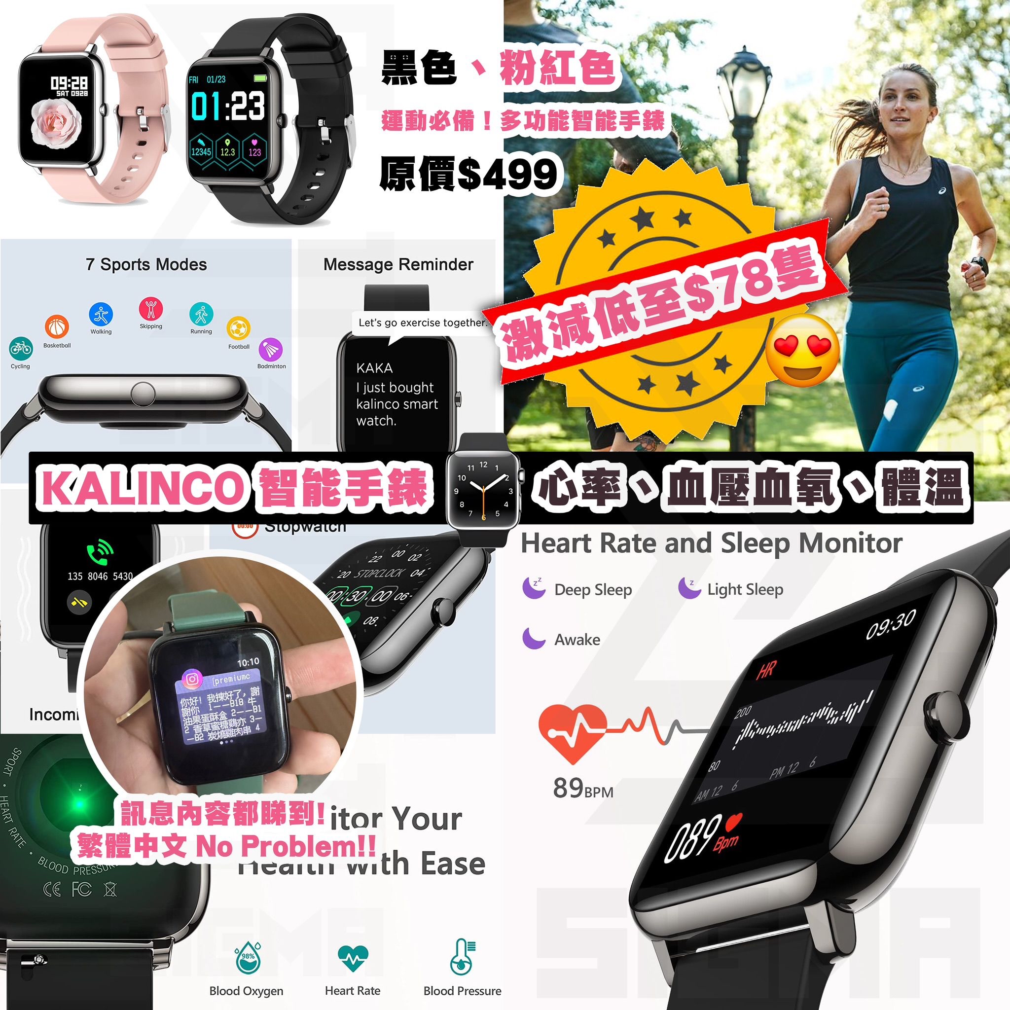 ❌❌ 原價 $499 ❌❌ 供應商激減低至 $89/隻,買到賺到呀😬 🌈KALINCO 智能手錶 A. 男款色系(隨機) B. 女款色系(隨機) #KALINCO 智能手錶功能真的是非常強大,可以測體溫、心率、血壓、血氧 另外還有多種運動💪🏻模式,可以隨身幫助我們記錄各種運動、讓我們更能持之以恆的堅持運動下去😌😌 大錶面還有多種個性化錶面可以更換,續航力長達7天,這樣就算要出遠門也不用擔心忘記帶充電線, 還支援遙控拍照📷音樂播放🎼訊息通知📩真的是個非常棒的隨身助理❤️ ✅高貴觸感視覺,用鋅合金同鋼化玻璃製作高清螢幕 ✅支援光學心率偵測、血氧飽和度偵測、血壓檢測同體溫監測 ✅進階睡眠分析,解讀 REM 快速動眼期 ✅選擇與家人分享健康數據,非常適合家中長者使用 ✅隨心選擇心愛錶盤,可以係手機相簿中選取鐘意唧相片做成錶盤 ✅電池續航力最高 14 日