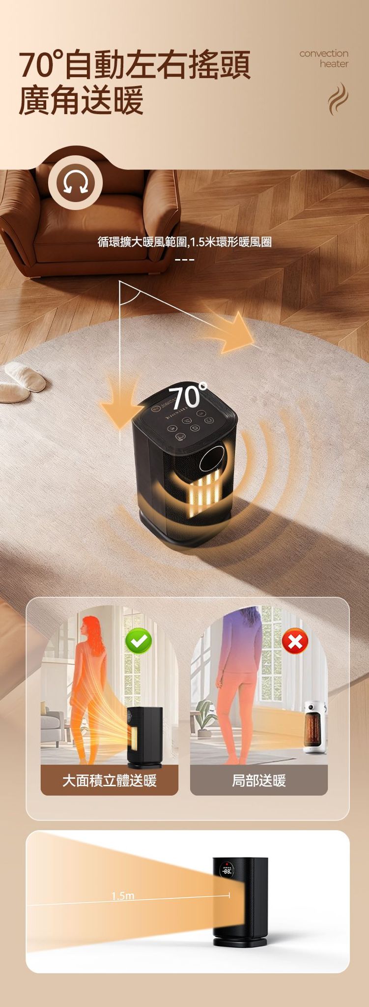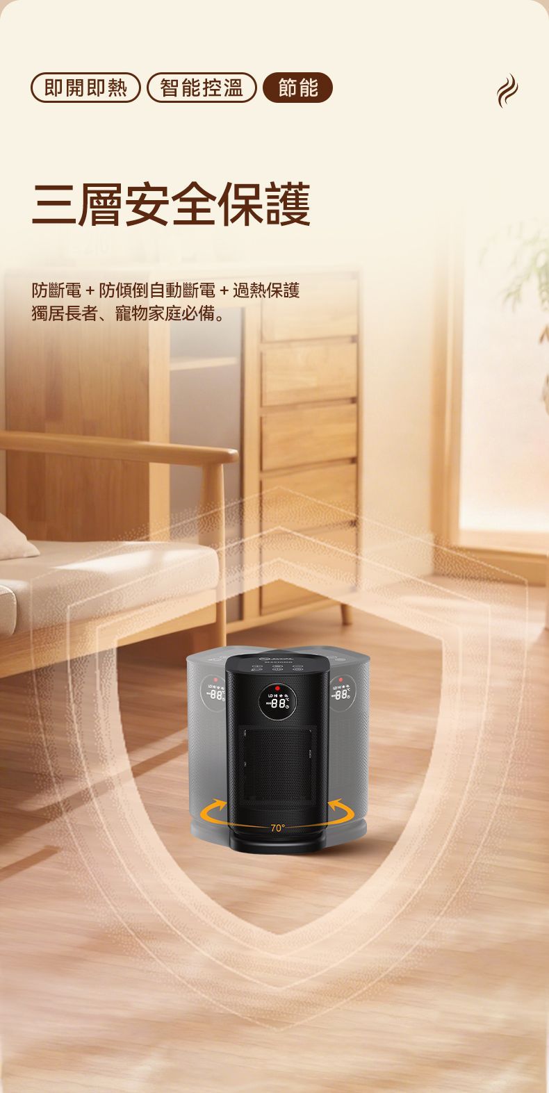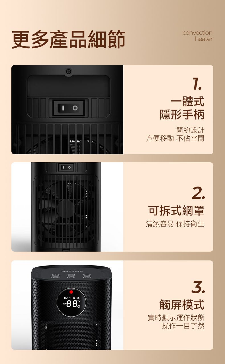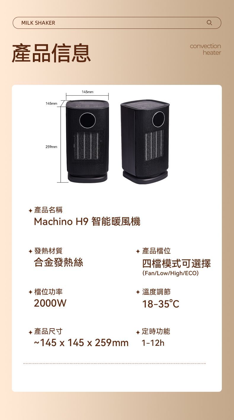 《pre-order》 💥預訂款💥需時大概7-21日💥 Machino H9 智能暖風機(可於浴室使用) 🇭🇰香港行貨,一年保養 ⭐️智能保暖⭐️安全節能⭐️浴室適用 MACHINO 🆕新出H9智能暖風機 搭配PTC陶瓷速熱,極速加暖。配備四檔智能模式(送風/低暖/高暖/ECO節能),18-35℃精準溫控隨心調節。 70°自動搖頭擴大送暖範圍,打造1.5米環形暖風圈!1-12小時預設關機+三重安全保護(防斷電、傾倒斷電、過熱保護)搭配遙控與觸屏雙操控,安全便捷,暖意覆蓋每個角落,讓您在❄️冬天也能打造溫暖舒適環境🥰 ✴️產品特點✴️ ✔️四檔智能模式:Fan(送風)/ Low(低暖)/ High(高暖)/ ECO(智能節能),一鍵切換。 ✔️精準溫控調節:18°C-35°C 多段溫度設定,冷暖恰到好處。 ✔️智能LED顯示屏:4色燈光對應四個檔位,實時顯示運作狀態,操作一目了然。 ✔️ECO智能節能減排模式:自動調節功率,達到省電、避免過熱、保持恆溫舒適等效果! ✔️12小時定時關機:預設關機時間1-12小時,節能又安心。 ✔️70°自動左右搖頭:廣角送暖,循環擴大暖風範圍(1.5米環形暖風圈)。 ✔️雙重操控設計:一按遙控器 + 機身觸屏控制,5米內輕鬆調溫。 ✔️三層安全保護:防斷電 + 防傾倒自動斷電 + 過熱保護,獨居長者、寵物家庭必備。 ✔️智能LED提示夜燈:30秒無操作自動調暗燈光,60秒完全熄燈。 ✔️PTC陶瓷瞬間速熱:極速加暖,無需等待。 ✔️一體式隱形手柄:簡約設計,方便移動不佔空間。 ✔️可拆式網罩:清潔容易,保持衛生。 ✴️產品規格✴️ 型號:H9 產品重量:約1.55kg 額定電壓:220-240V~ 額定頻率:50-60Hz 額定功率:2000W 產品尺寸:約145×145×259mm ⚠️注意⚠️ 避免放置在潮濕處:切勿將暖風機放置在有機會注滿水的位置附近,絕對不能放在洗手盆或浴缸附近,以免意外落水觸電。 ⚠️注意⚠️ 如在浴室使用後,先拔除電源,待機身冷卻後,將暖風機放置在室內乾燥地方,勿將暖風機長期擺放浴室,以免發生危險,使用前請小心閱讀使用說明書。