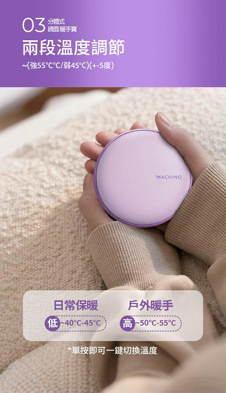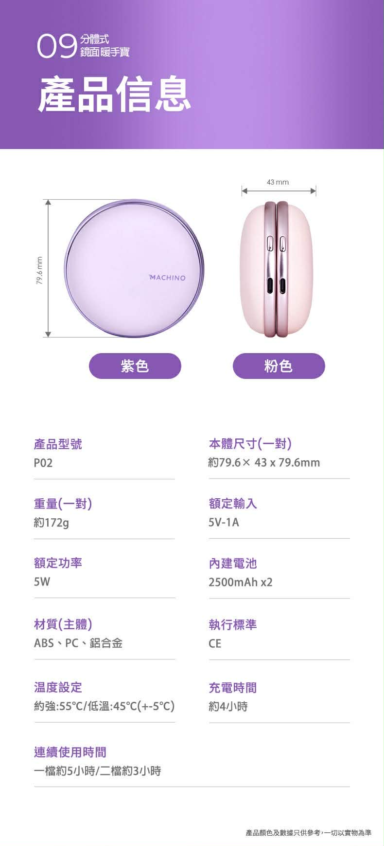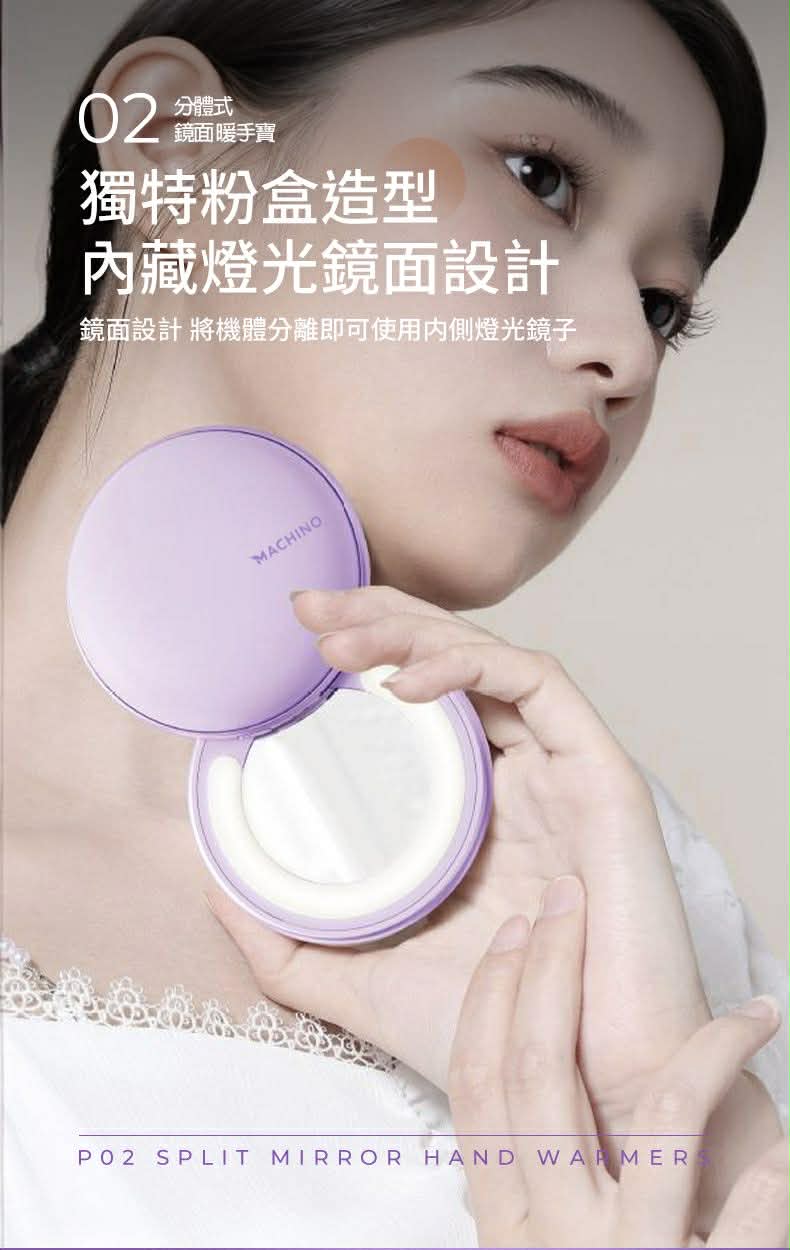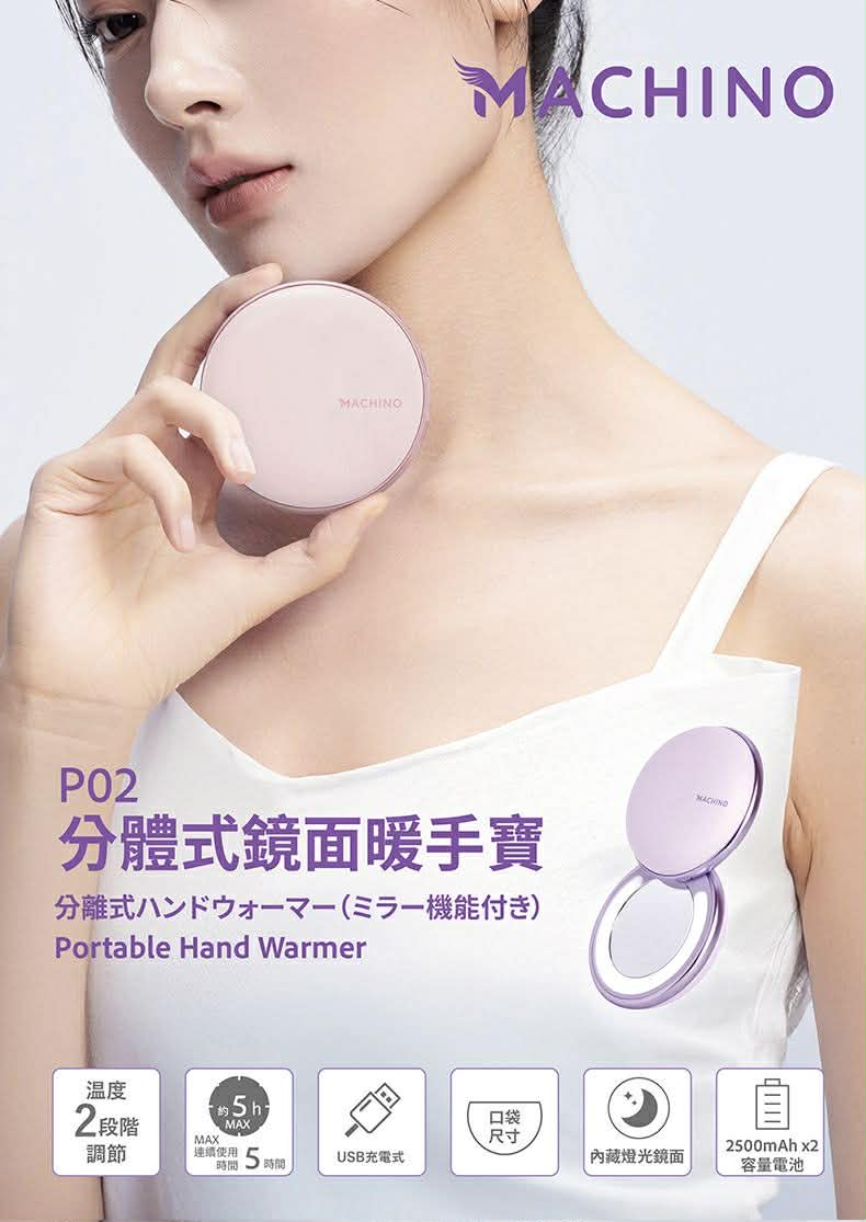 《pre-order》 💥預訂款💥需時大概7-21日💥 Machino P02 分體式鏡面暖手寶 🇭🇰香港行貨,一年保養 冬天又快到了🥶MACHINO 新出P02 分體式鏡面暖手寶🆕全新登場🥳🥳 獨特粉盒造型內藏燈光鏡面設計,讓女士們隨時補妝整理儀容🥰 磁吸機身可一分為二,強/弱兩段獨立溫控(45/55℃)隨時與朋友共享。內建兩個2500mAh電池,最長續航可高達約5小時, 172g輕巧設計,雙擊開啟防誤觸,是您冬日必備的時尚暖心產品,就在今個冬天將溫暖與優雅隨身攜帶👍🏻 🌈有兩色可供選購 紫色 粉紅色 ✔️獨特粉盒型外觀設計,內置燈光鏡面 ✔️兩段溫度調節,(強55℃/弱45℃)(+-5度) ✔️無線輕巧,只有口袋大小,可以放在任何地方 ✔️磁吸二合一機身設計,一機兩用,與他人共享暖手功能 ✔️鏡面設計,將機體分離即可使用內側燈光鏡子 ✔️誤操作預防設計,雙擊開啟功能安全安心 ✔️輕巧精緻,重量只有約172g ✔️機體由兩個電池組成容量高達2500mAh*2,可分開使用 ✴️產品規格✴️ 產品型號:P02 本體尺寸(一對) :約79.6× 43 x 79.6mm 重量(一對) :約172g 額定輸入:5V-1A 額定功率:5W 內建電池:2500mAh x2 材質(主體) :ABS、PC、鋁合金 執行標準:CE 温度設定:強: 55℃/低溫: 45℃(+-5℃) 充電時間:約4小時 連續使用時間:一檔約5小時/二檔約3小時