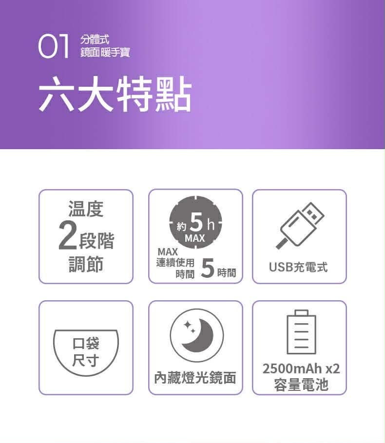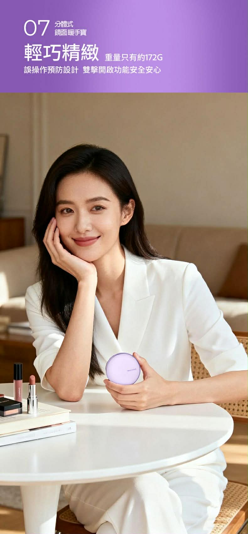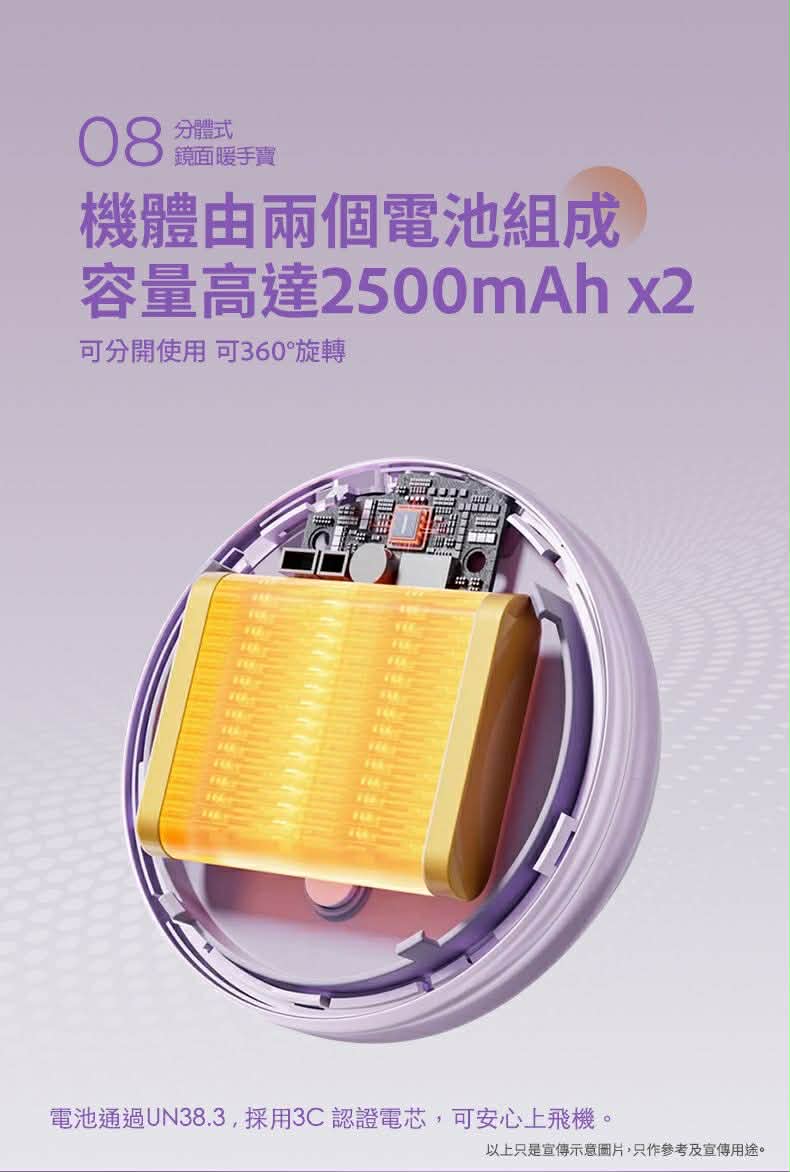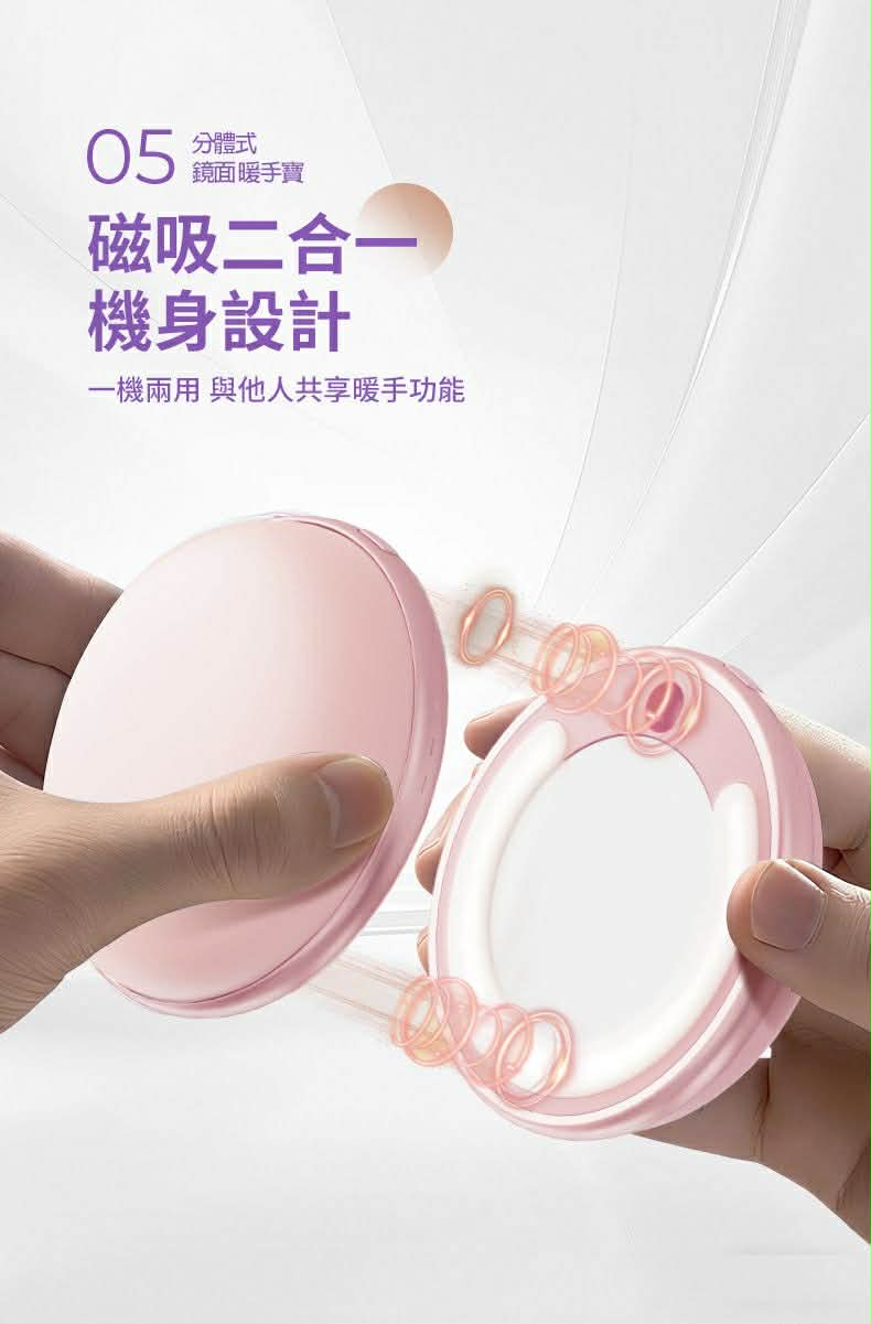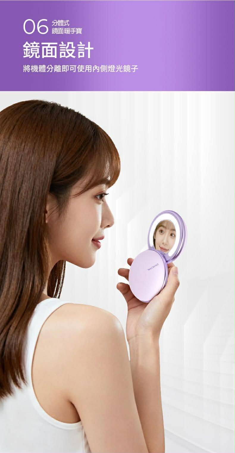 《pre-order》 💥預訂款💥需時大概7-21日💥 Machino P02 分體式鏡面暖手寶 🇭🇰香港行貨,一年保養 冬天又快到了🥶MACHINO 新出P02 分體式鏡面暖手寶🆕全新登場🥳🥳 獨特粉盒造型內藏燈光鏡面設計,讓女士們隨時補妝整理儀容🥰 磁吸機身可一分為二,強/弱兩段獨立溫控(45/55℃)隨時與朋友共享。內建兩個2500mAh電池,最長續航可高達約5小時, 172g輕巧設計,雙擊開啟防誤觸,是您冬日必備的時尚暖心產品,就在今個冬天將溫暖與優雅隨身攜帶👍🏻 🌈有兩色可供選購 紫色 粉紅色 ✔️獨特粉盒型外觀設計,內置燈光鏡面 ✔️兩段溫度調節,(強55℃/弱45℃)(+-5度) ✔️無線輕巧,只有口袋大小,可以放在任何地方 ✔️磁吸二合一機身設計,一機兩用,與他人共享暖手功能 ✔️鏡面設計,將機體分離即可使用內側燈光鏡子 ✔️誤操作預防設計,雙擊開啟功能安全安心 ✔️輕巧精緻,重量只有約172g ✔️機體由兩個電池組成容量高達2500mAh*2,可分開使用 ✴️產品規格✴️ 產品型號:P02 本體尺寸(一對) :約79.6× 43 x 79.6mm 重量(一對) :約172g 額定輸入:5V-1A 額定功率:5W 內建電池:2500mAh x2 材質(主體) :ABS、PC、鋁合金 執行標準:CE 温度設定:強: 55℃/低溫: 45℃(+-5℃) 充電時間:約4小時 連續使用時間:一檔約5小時/二檔約3小時